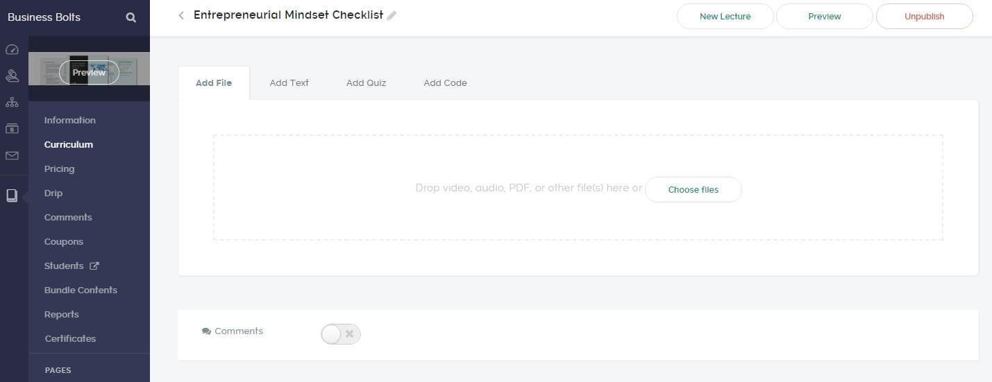 Just click on the ‘New Lecture’ button and you’ll be taken to a page where you can add an audio file, a PDF, or a video file. In addition to the ‘Add File’ tab, you can also click on different tabs to add text, a quiz, or code.