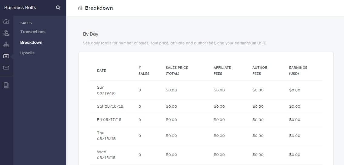 You can click on Breakdown and it’ll show you the transactions by day. Which again, I won’t have any, but it’s a nice layout of your earnings day-by-day.
