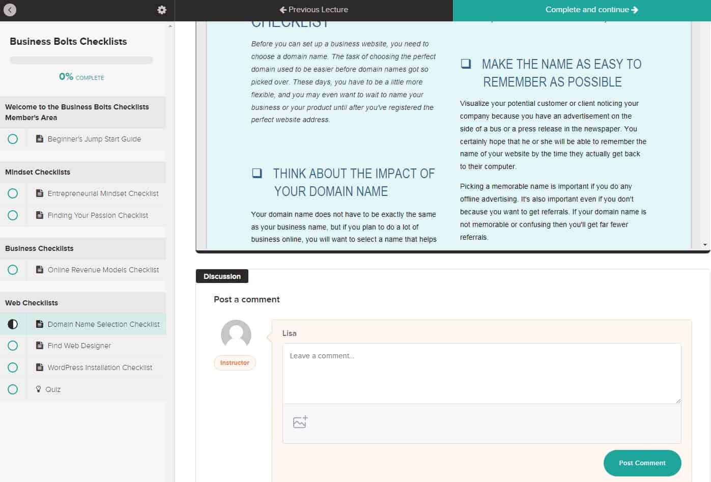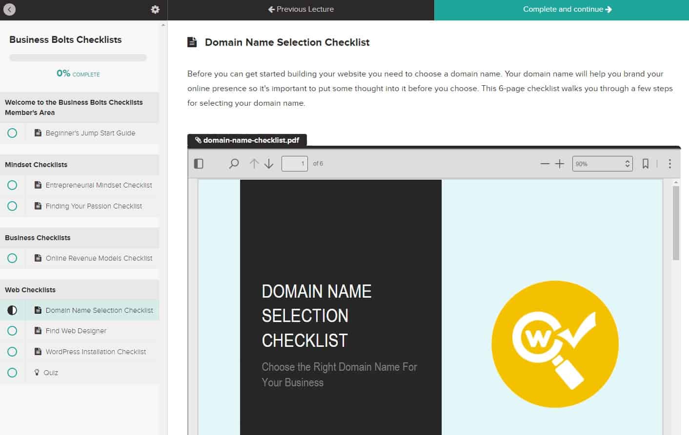 I really like how in the menu on the left, the section is highlighted (it’s the bold ‘Web Checklists section’) and the lessons or lectures, or in my case the checklists are under it (in the screenshot above, it’s the ‘Domain Name Selection Checklist). Notice that the link has a half-filled circle in the left-hand menu above. That’s because you’re working on it.