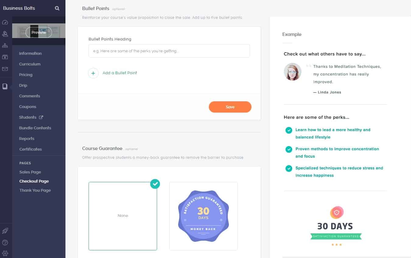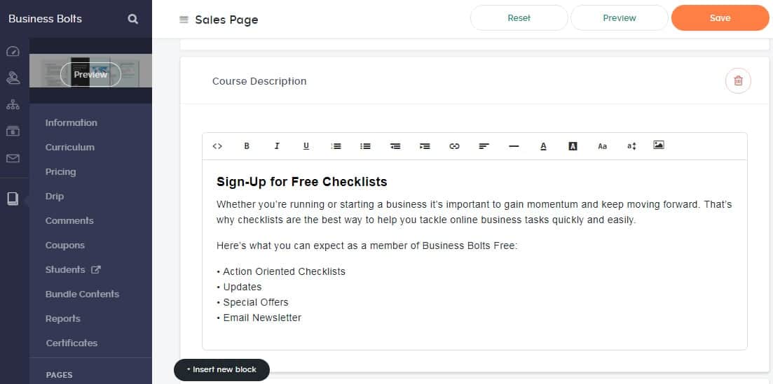 You can add in a course description, a little about you, FAQs, and any other type of sales content you’d like.
