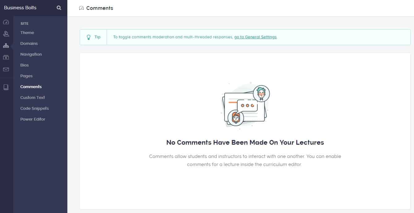 The comments link takes you to a page where you can see and manage all the comments your students sent in your courses. There’s not much to do here until you get some comments.