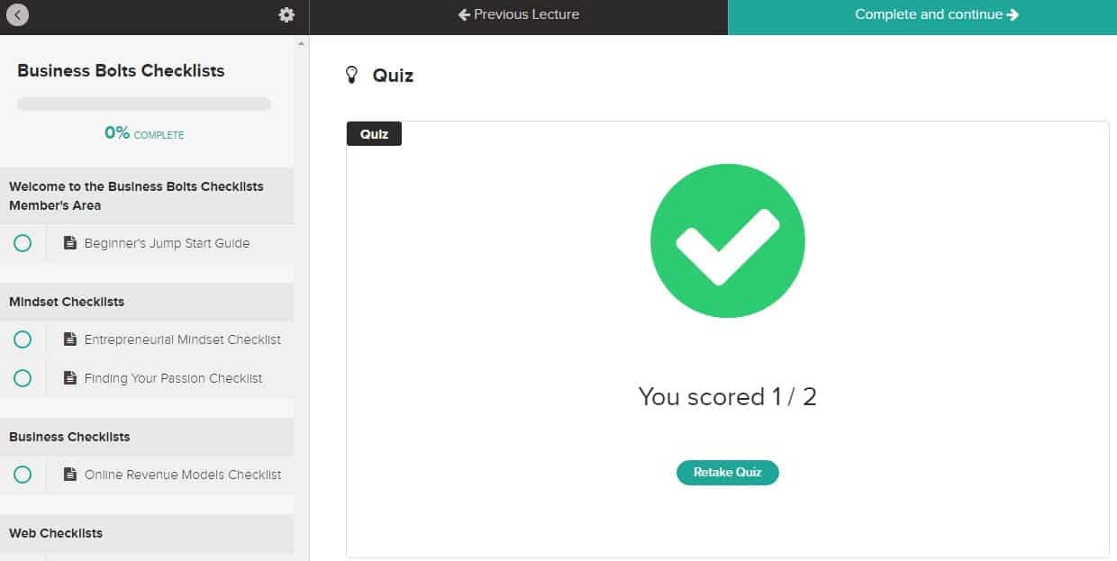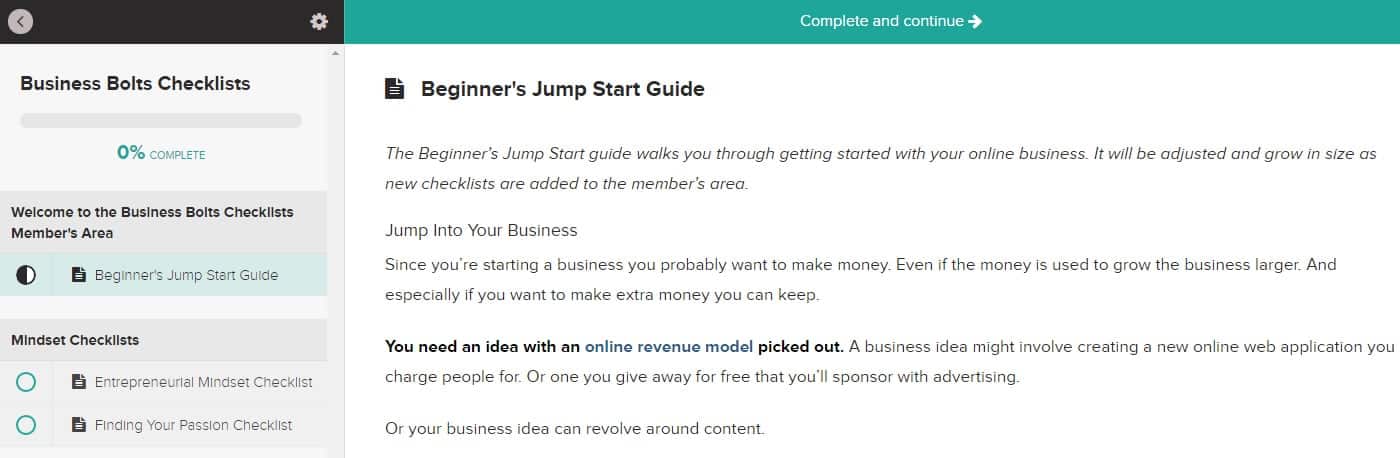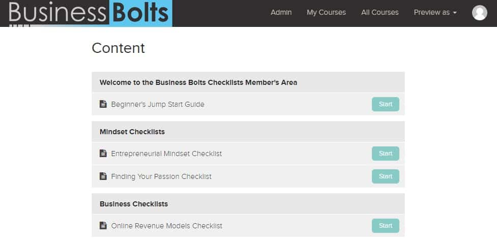 Once I click on the Business Bolts Checklists link under ‘COURSES’, I’m taken to a page like this: