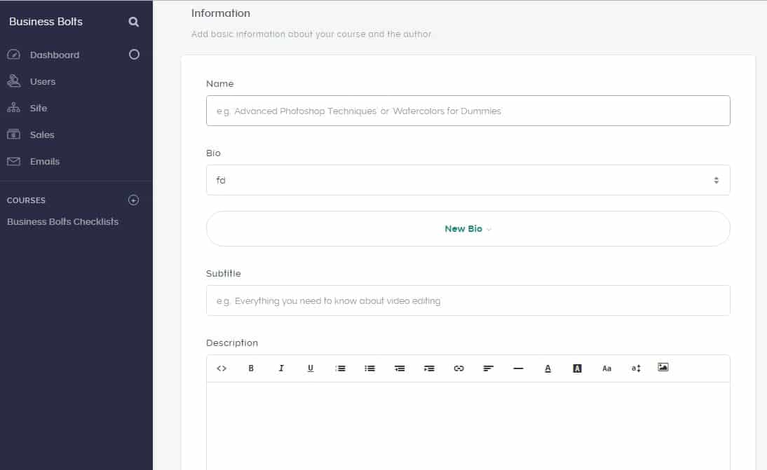The first thing to do is enter a name for your course. Mine is Business Bolts Checklists. I know that’s kind of ‘meh’, but it conveys what it is to people.