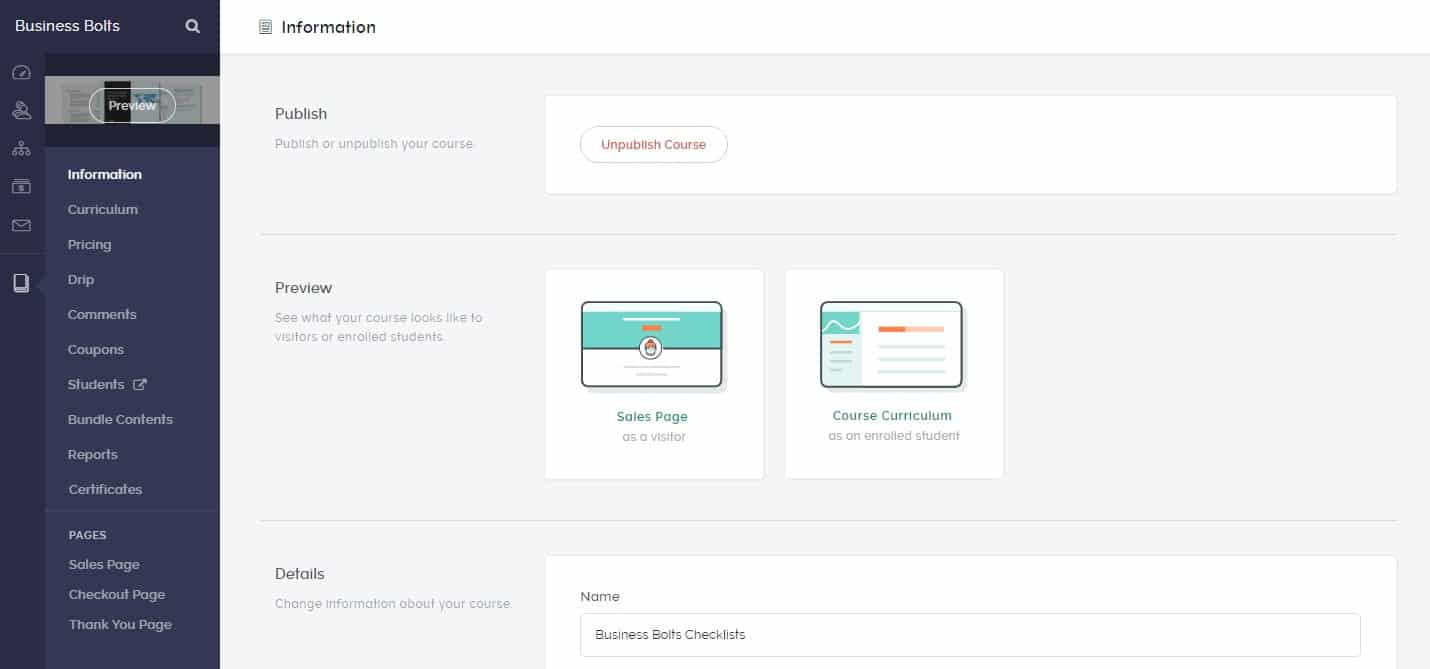 It’s got all the course information again along with preview links so you can see what your course looks like whenever you want.