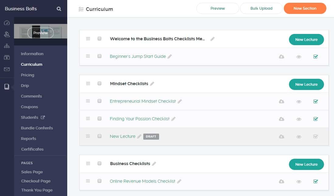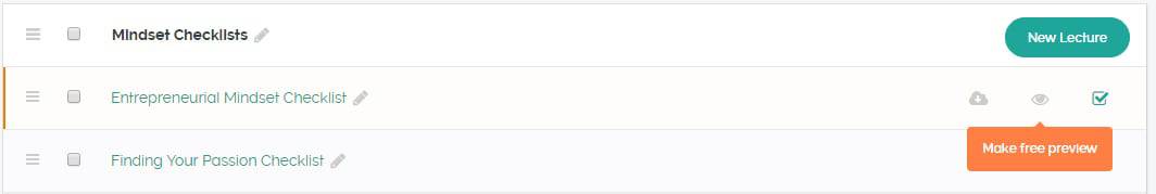 I have a collection of checklists in my course that fit into a few different categories. I used the category names as my sections and then put the individual checklists under each section. In the screenshot above, you can see ‘Mindset Checklists’. That’s a section heading. So is ‘Business Checklists’.