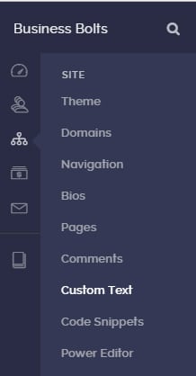 It’s under Site and then Custom Text. There are actually two different menus in this screenshot. There’s one on the left that’s just icons. The first icon is the Dashboard page, the second is for Users, the third is for Site. Once you hover over that, you’ll see the second menu show up. That one has Custom Text down a bit and that’s what you want to click on.