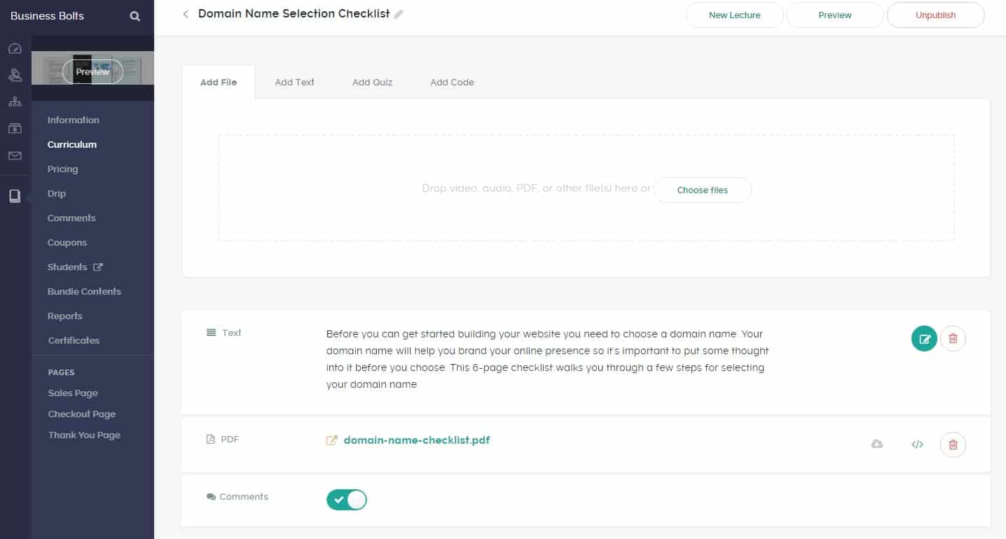 You have complete control over how each of your lessons (or in my case content pages) looks. Again, videos or other files along with text, quizzes, comments, and code can go on each of these pages.