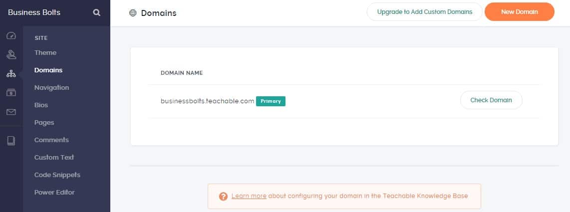As you can see my domain on Teachable is businessbolts.teachable.com. So I have a subdomain on the teachable.com website. You can check the domain here and also upgrade to add a custom domain.
