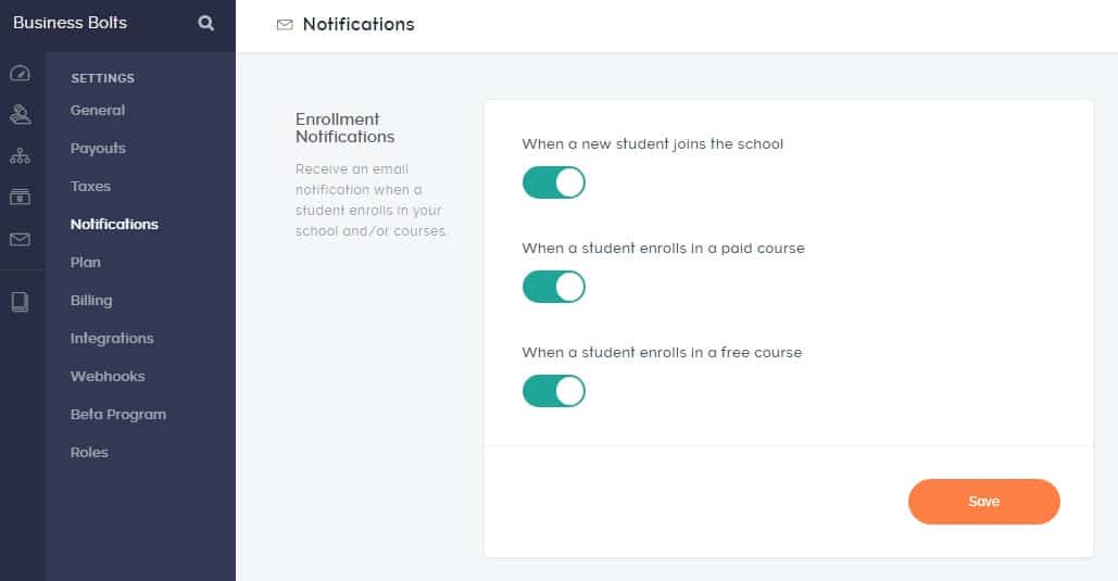 The Notifications link just let’s you toggle on or off when you’d like to be notified by Teachable for certain actions. The first block allows you to control your enrollment notifications. You can get notified when a new student joins the school and/or when a student enrolls in a paid course and a free course.
