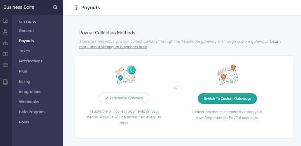 You can select from the Teachable Gateway where Teachable handles your payments and pays you every 30 days. Alternately you can switch to a custom gateway which includes Stripe or Paypal. You can also enter your Paypal address on this page. That’s how Teachable will pay you if you choose to let them run the transactions.