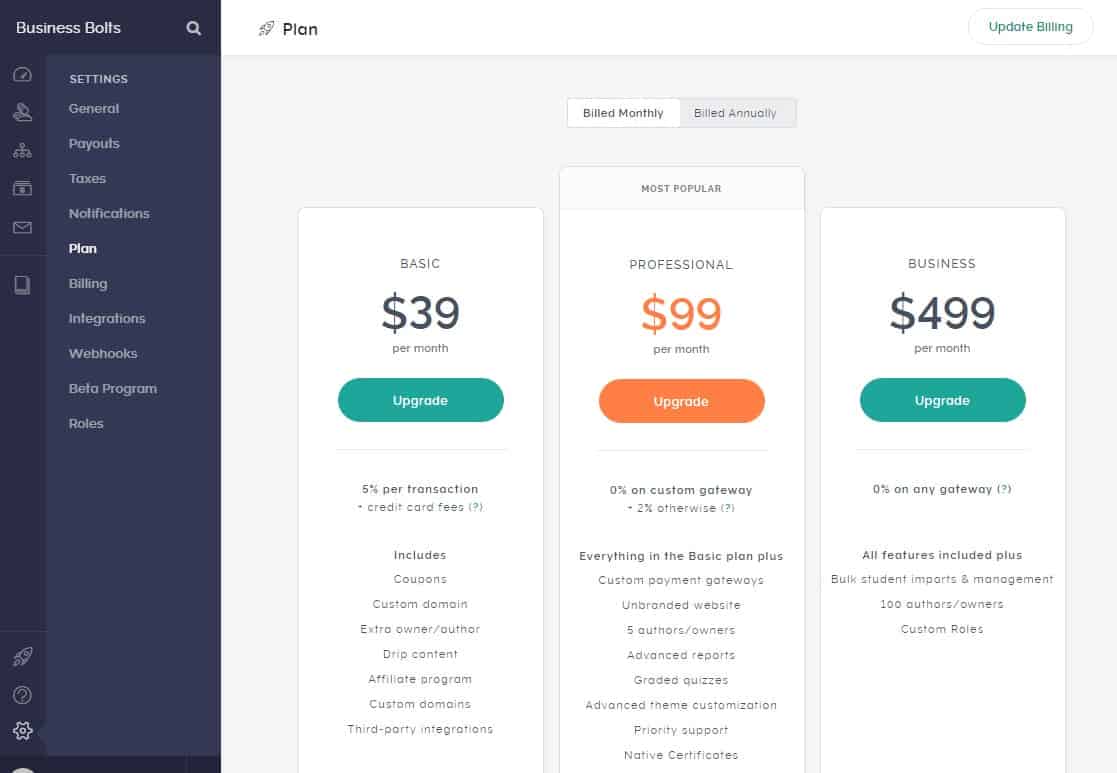 As you can see, the next plan up from free is the Basic plan at $39 a month when billed monthly. There are a lot of features in this plan, but you will still be billed 5% per transaction + whatever your credit card fees are. So if you’re selling a lot of your courses that will add up.