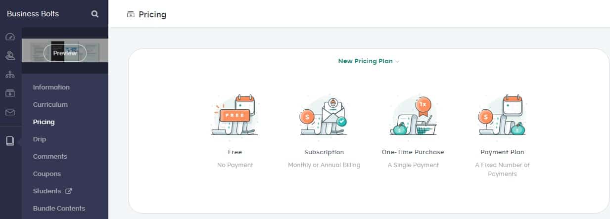 Here’s where you’ll pick a price option. There’s free, a subscription (which can be monthly or annual), a one-time purchase, and a payment plan.