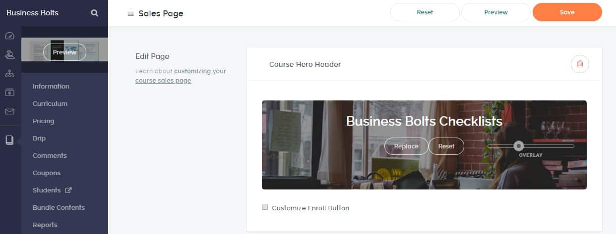 The first page you can customize is the Sales Page. This is where your students will enroll in your course. You always want to ‘sell’ your course even if it’s free so you need a Sales Page even if you’re not charging. It’s the page where you tell people a little about what they’re going to get by enrolling in your course and allow them to enroll.