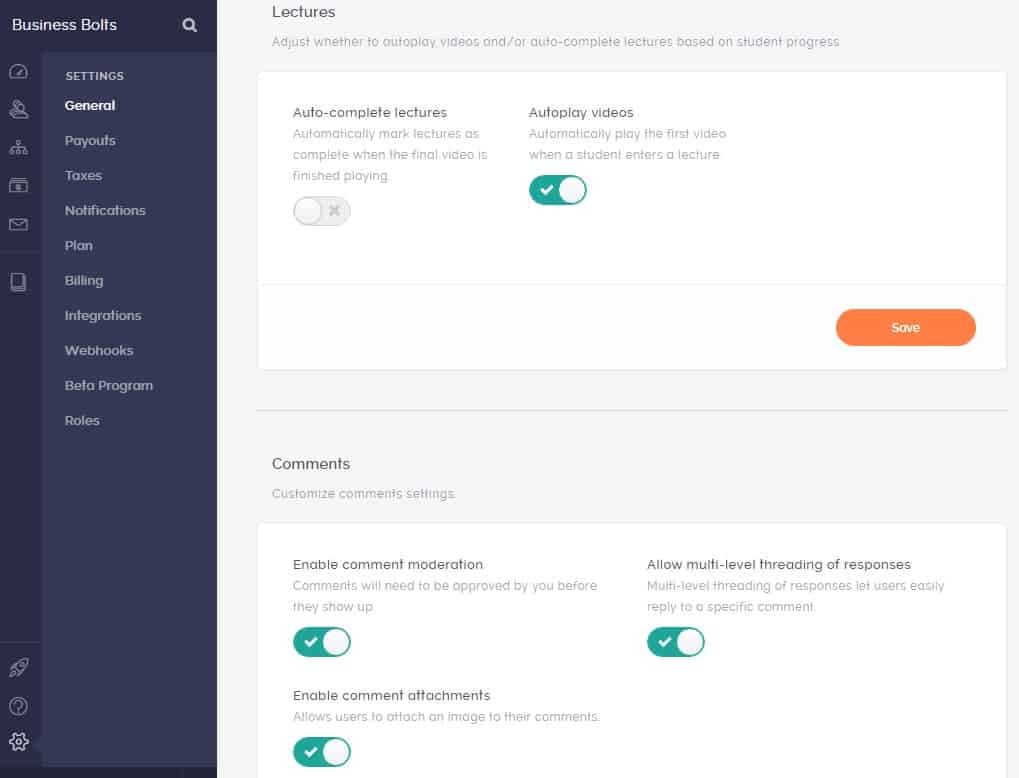 You can also enable comments right in that lesson/lecture (by clicking on that toggle) which also isn’t something every LMS can do. You’ll see the comments box at the bottom. I don’t have comments toggled on in this screenshot.