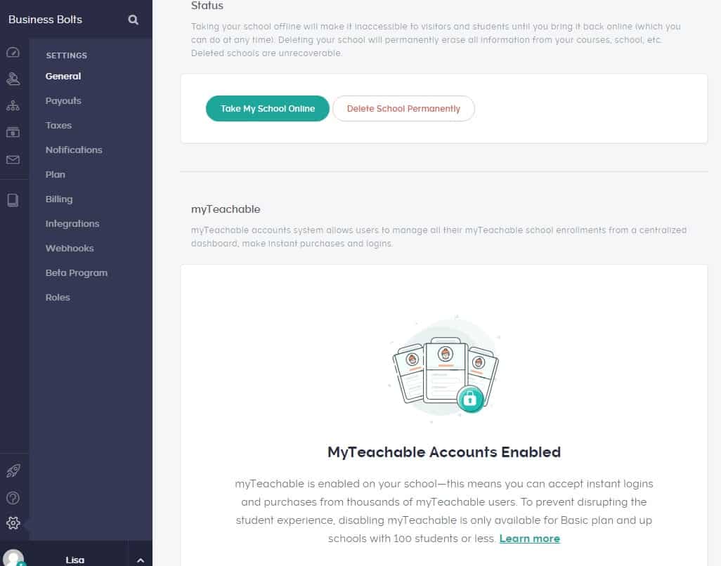 The last two blocks under the General settings include your course status and enabling myTeachable accounts.