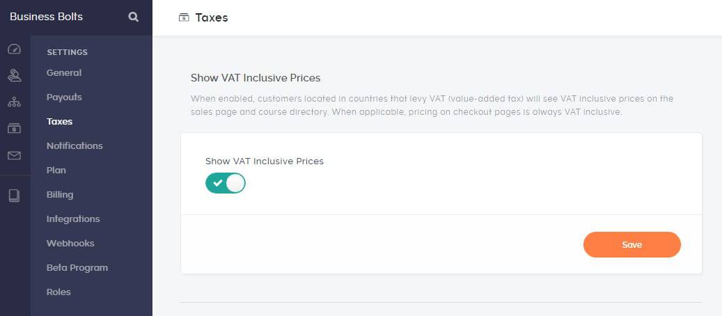 The taxes link let’s you show VAT inclusive prices when customer are in countries that charge a VAT. You can choose to toggle this on or off.