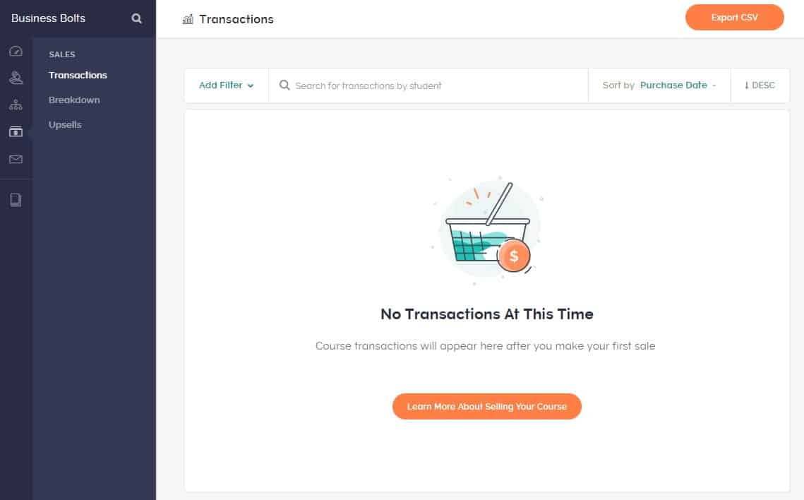 Next up is the Sales icon. Clicking on it will take you to your transactions. As you can see, I don’t have any. Bummer. But my course is free so there wouldn’t be any reason for me to click on this.