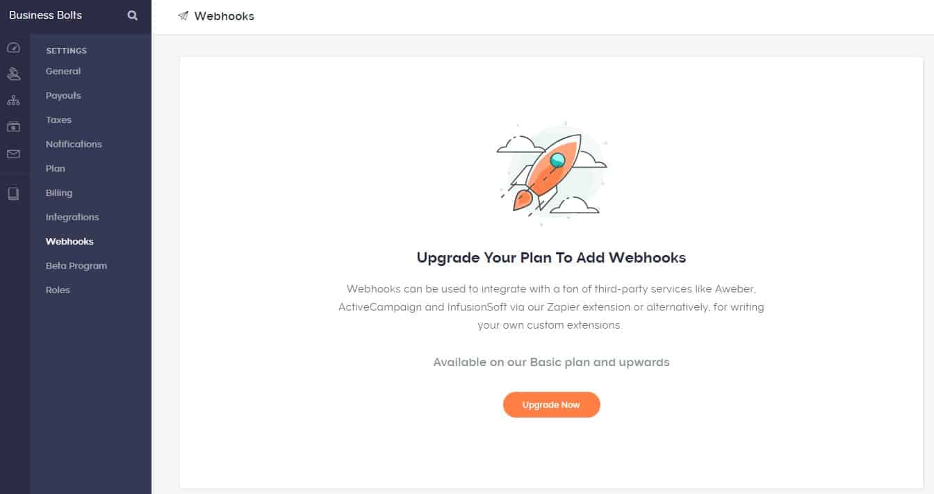 If you’re on the free plan, the Webhooks link takes you to a page where you’ll be asked to upgrade to a paid plan if you want to use this feature.